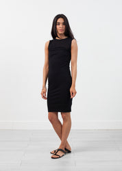 The Desna Dress is an excellent seasonal piece. Layering is optional with its lightweight, barely sheer body-con shape. Skirt reaches knee-length. Sew-in slip. Crew neckline. Color Black. 100% Pima Cotton. Made in the U.S.A.